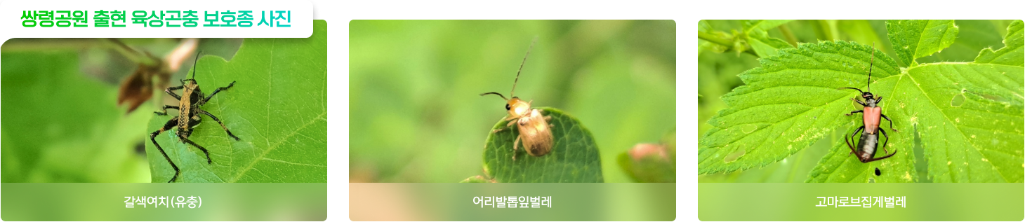 쌍령공원에서 출현한 육상곤충은 14목 88과 192분류군으로 한국고유종 16분류군, 외래종 4분류군, 생태계교란야생생물은 갈색날개매미충, 미국선녀벌레, 주홍날개꽃매미 등 3분류군으로 확인되었다.