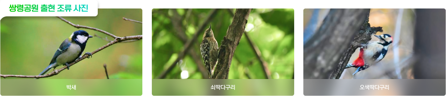 쌍령공원에서 확인된 조류는 8목 18과 34종 181개체가 확인되었으며, 법정보호종은 솔부엉이(천연기념물 제324호-3호), 소쩍새(천연기념물 제324-6호), 새호리기(멸종위기 야생생물 Ⅱ급)이 확인되었다.