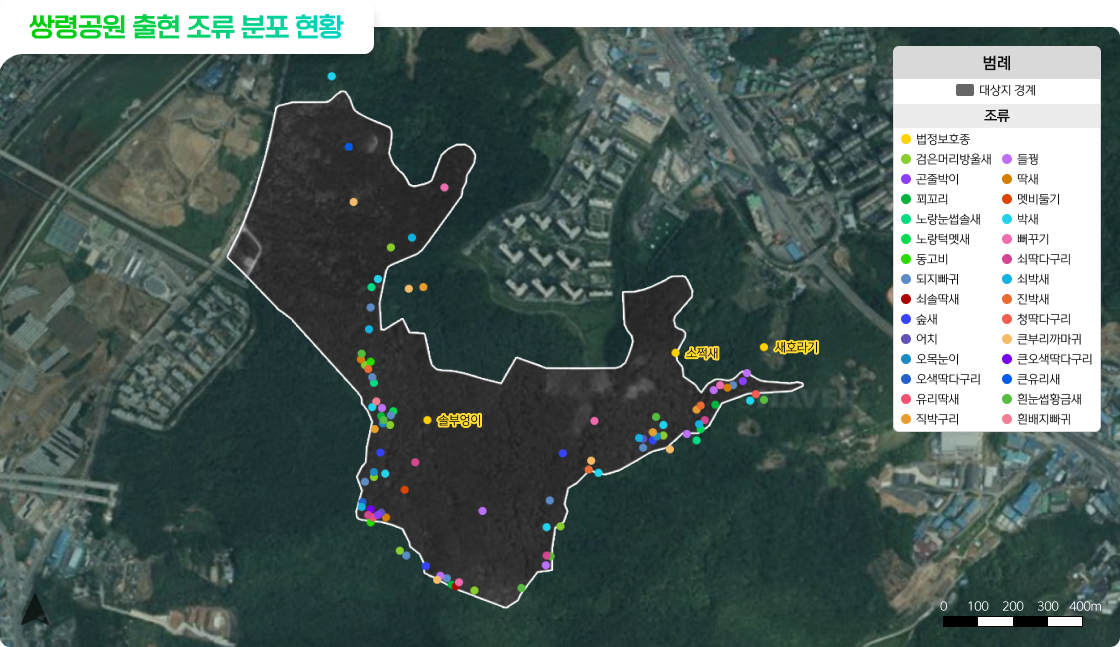 쌍령공원 출현 조류 분포와 법정 보호종의 위치를 표시한 지도는 다음과 같다.
