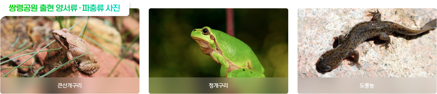 쌍령공원에서 출현한 양서·파충류는 2목 4과 6분류군으로 확인되었다. 보호종 중 한국고유종은 큰산개구리 1분류군, 경기도 보호 야생생물은 도롱뇽, 한국산개구리 등 2분류군이 대상지 500m 반경 수계와 논에서 번식이 확인되었다.