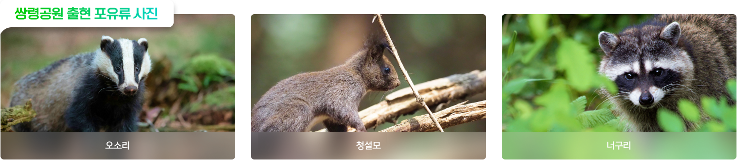 쌍령공원에서 확인된 포유류는 4목 5과 6종이 확인되었으며, 법정보호종은 확인되지 않았다. 고라니는 배설물, 족적, 목견, 청설모는 목견, 오소리는 굴 흔적, 배설물, 두더지는 굴 흔적, 개와 너구리는 배설물을 통해 해당 종의 서식을 확인할 수 있었는데, 이외에도 다른 소형 설치류의 것으로 추정되는 굴이 다수 발견되어 추가적인 포유류(설치류)의 서식 가능성도 예측된다.