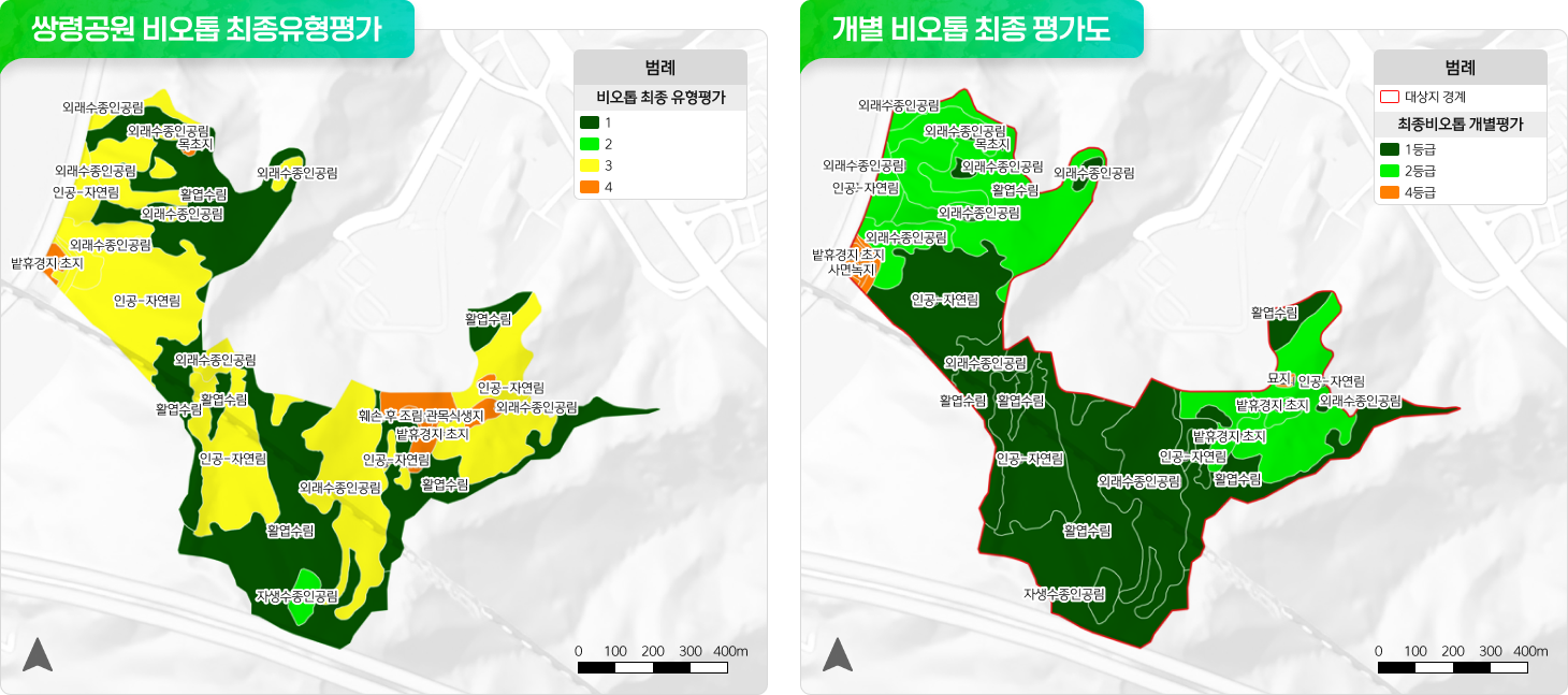 | 비오톱 지도 제작 및 평가 | 토지이용현황, 자연환경조사를 바탕으로 비오톱 유형화 및 평가 진행 | |