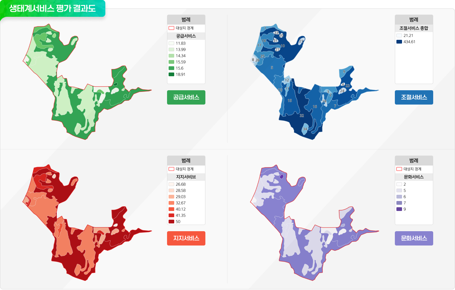 서울연구원에서 발행한 「서울시 생태계서비스 평가체계 구축과 활용방안」¹ 보고서를 활용하여 도시특성을 고려한 생태계서비스 평가를 진행하였다. 공급, 조절, 문화, 지지서비스 4개의 분야로 나누어 쌍령공원의 생태계서비스를 평가한 결과는 다음과 같다.
