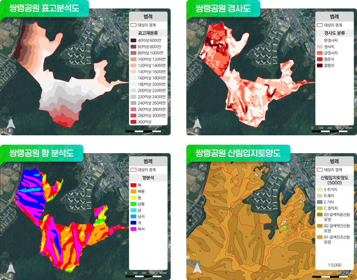 대상지의 일반현황을 파악하고자 표고, 경사, 향 등 지형분석과 지질 및 토양분석 현황을 파악하였다. 쌍령공원은 35m부터 305m까지 분포하여있고, 북쪽의 주거지 근방이 가장 낮고, 남쪽의 산지로 점차 높아지는 형세를 이룬다. 대부분 완경사지와 경사지로 이루어져 있어 대체적으로 완만하다. 또한, 대부분 북향과 북동향으로 대다수의 수목이 북 방향을 이루고 있는 것을 확인하였다. 산림입지토양도(1:5000)을 통해 분석한 토양현황 결과, 대다수의 토양은 갈색산림토양으로 이루어져있으며, 일부 주거지, 제지, 경작지가 위치하고 있다.
