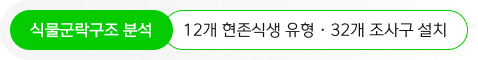 | 대상지 생태현황 파악 | 식물분포 및 서식현황 | 식물상, 현존식생, 주요 보호식물 분포, 주요 관리식물 분포, 식물군집구조 조사 및 분석 |