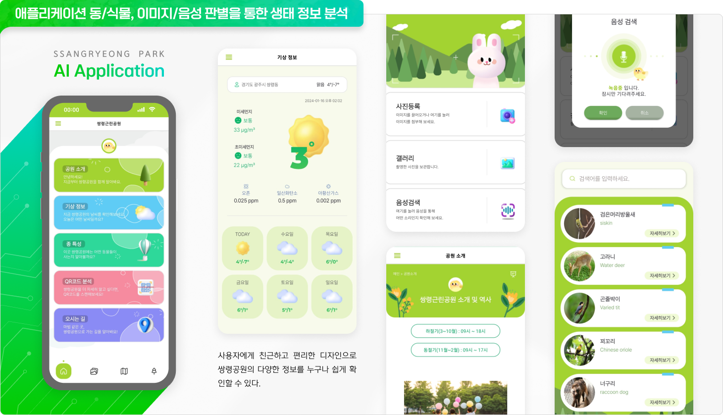 쌍령근린공원은 어린이·역사를 대주제로 어린이와 가족이 함께 즐길 수 있는 다양한 공간을 제공하고 광주의 역사와 예술이 공존하는 공원 조성을 목표로 한다. 쌍령근린공원이 위치한 마름산은 우수한 자연경관을 가지고 있어 어린이들에게 생태체험과 교육 프로그램 등 다양한 생태계서비스를 제공할 수 있다는 장점이 있다. 이를 기반으로 시민들은 쌍령근린공원에서 배움과 체험, 성장 경험을 제공할 수 있으며 시민과학자 양성의 기반이 될 수 있다. 본 사업에서는 사람, 환경, 생물, 역사 등 조경 빅데이터를 인공지능을 통해 분석해 쌍령근린공원 이용객들에게 다양한 정보를 제공하는 것을 목적으로 한다. 이를 위해 쌍령근린공원 서식 생물, 환경, 역사 등 다양한 정보를 수집하였고, 현장에서 사진 촬영과 울음소리 녹음으로 서식 생물을 검색할 수 있는 딥러닝 모델을 개발했다. 마지막으로 수집된 정보와 개발한 딥러닝 모델을 이용객들에게 제공할 수 있도록 애플리케이션을 개발했다.
